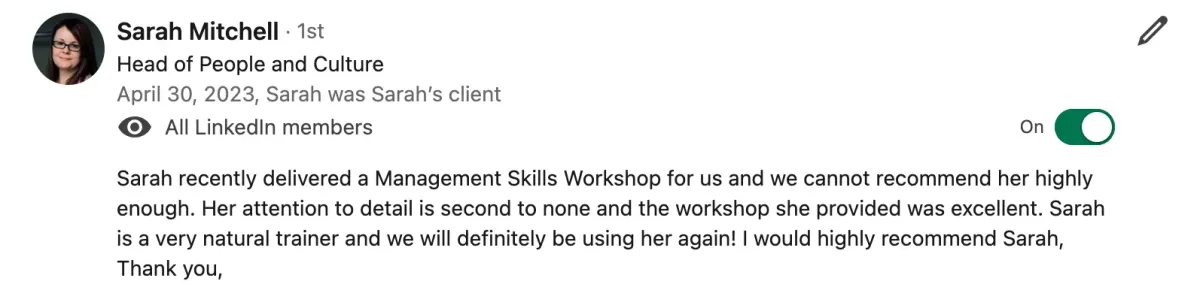 "Sarah is a great communicator and she delivered in great detail all new ideas and framework. She was prepared and knowledgeable"